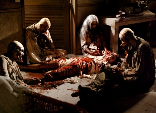 2. Most memorable scene :a voyeuristic zombie with blue hands somehow snuck into the house without being noticed and invited a few of his buddies to partake in an impromptu buffet.